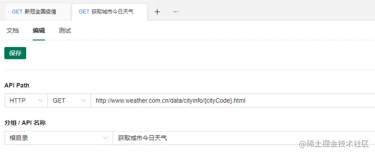 在编辑 API 的顶部填写 API 的请求协议、方式、地址、名称;