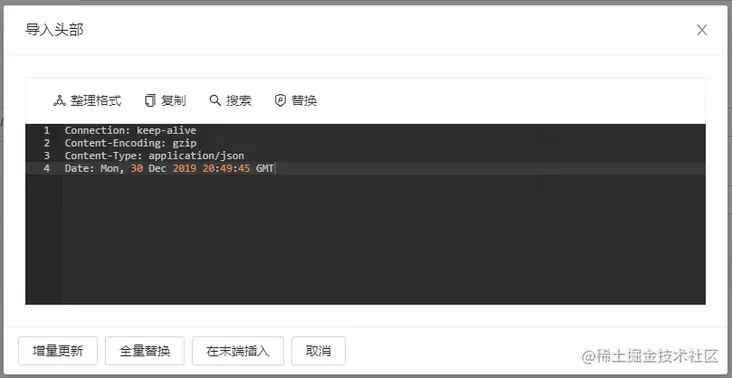 你可以输入或导入响应头部。批量导入的数据格式为 key : value ,一行一条 header 信息,如: