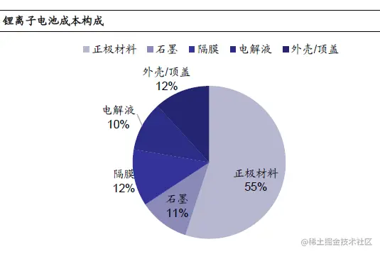 用。正极材料最常用的为钴酸锂、锰酸锂、磷酸铁锂和三元材料,其性能直接影响锂离子电池性能。从锂离子电池的成本结构来看,正极材料成本占比最大,