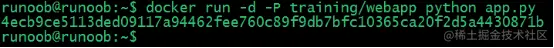 runoob@runoob:~# docker run -d -P training/webapp python app.py