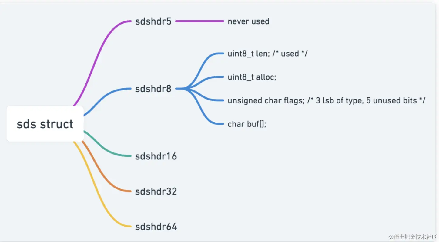 SDS 结构中有一个元数据 flags,表示的是 SDS 类型(最低 3 位)。事实上,SDS 一共设计了 5 种类型,分别是 sdshdr5、sdshdr8、sdshdr16、sdshdr32 和 sdshdr64。这 5 种类型的主要区别就在于,它们数据结构中的字符数组现有长度 len 和分配空间长度 alloc,这两个元数据的数据类型不同。