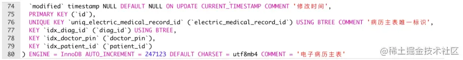 PRIMARY KEY (id), UNIQUE KEY uniq_rx_id (rx_id), KEY idx_diag_id (diag_id), KEY idx_doctor_pin (doctor_pin) USING BTREE, KEY idx_rx_storeId (store_id), KEY idx_parent_rx_id (parent_rx_id) USING BTREE, KEY idx_rx_status (rx_status) USING BTREE, KEY idx_doctor_status_type (doctor_pin, rx_status, rx_type), KEY idx_business_store (business_type, store_id), KEY idx_doctor_pin_patientid (patient_id, doctor_pin) USING BTREE, KEY idx_rx_create_time (rx_create_time)