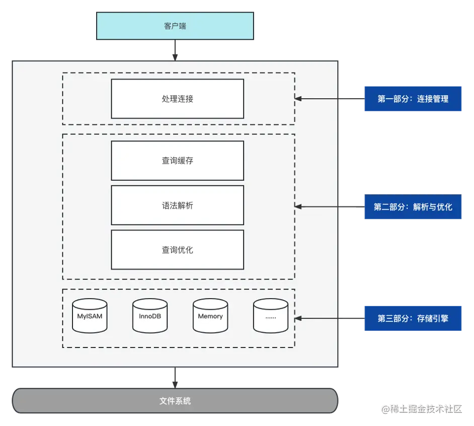 我们重点关注第二部分和第三部分,第二部分其实就是Server层,这层主要就是负责查询优化,制定出一些执行计划,然后调用存储引擎给我们提供的各种底层基础API,最终将数据返回给客户端。