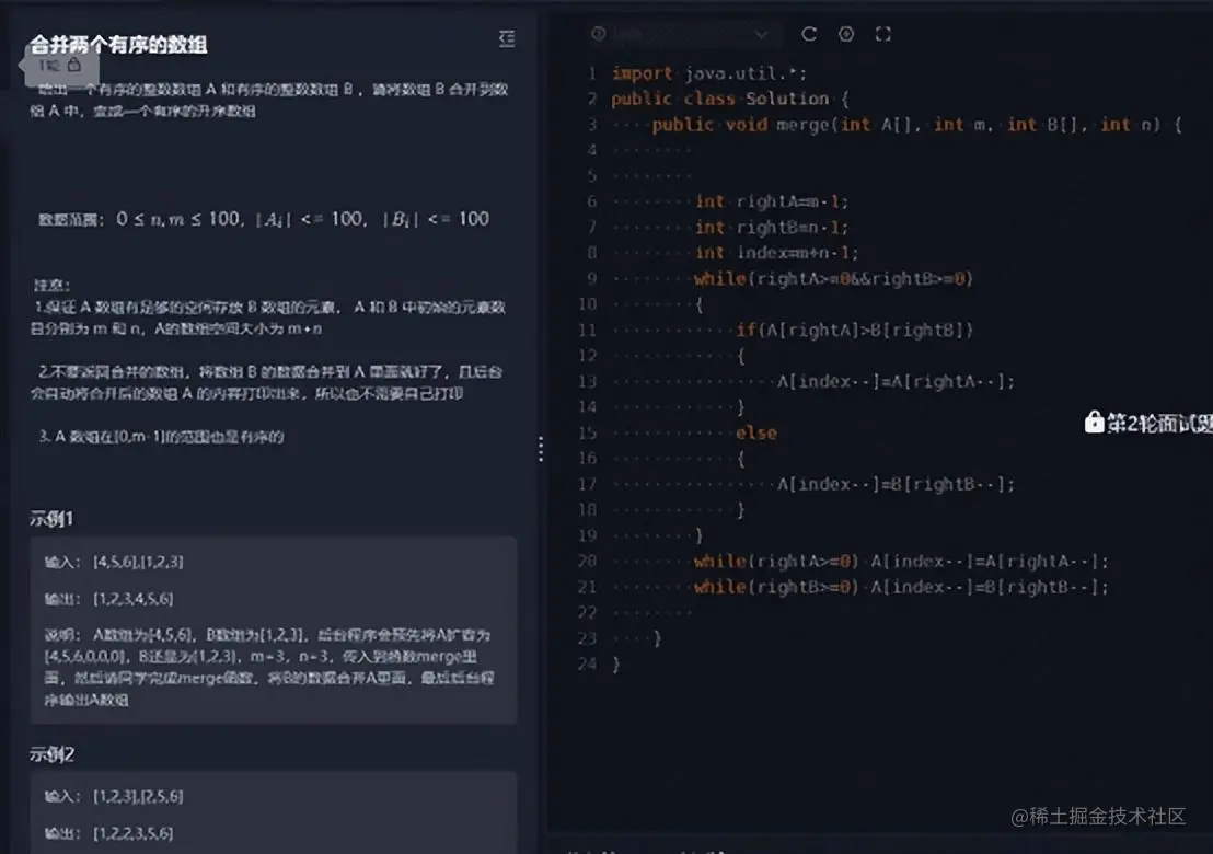 13.算法题:合并有序数组 O(N)时间 O(1)空间。