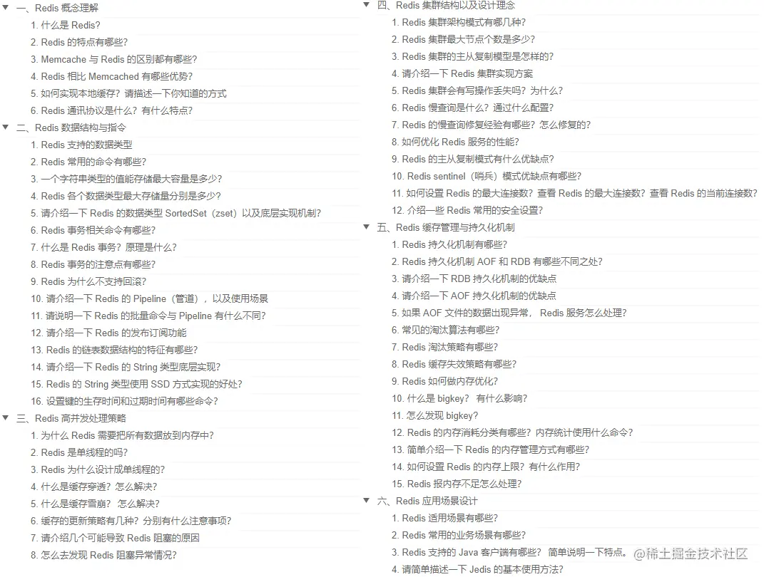 Redis 是一个高性能的分布式内存型数据库,被国内外几乎所有的大小型公司所使用,例如 Twitter、Stack Overflow、Github、阿里巴巴、腾讯、新浪微博等,它也早已成为互联网公司的标配,所以对 Redis 的掌握也成为后端工程师必备的基础技能,无论是面试还是实际工作中,我们每时每刻都需要和 Redis 打交道。目录如下: