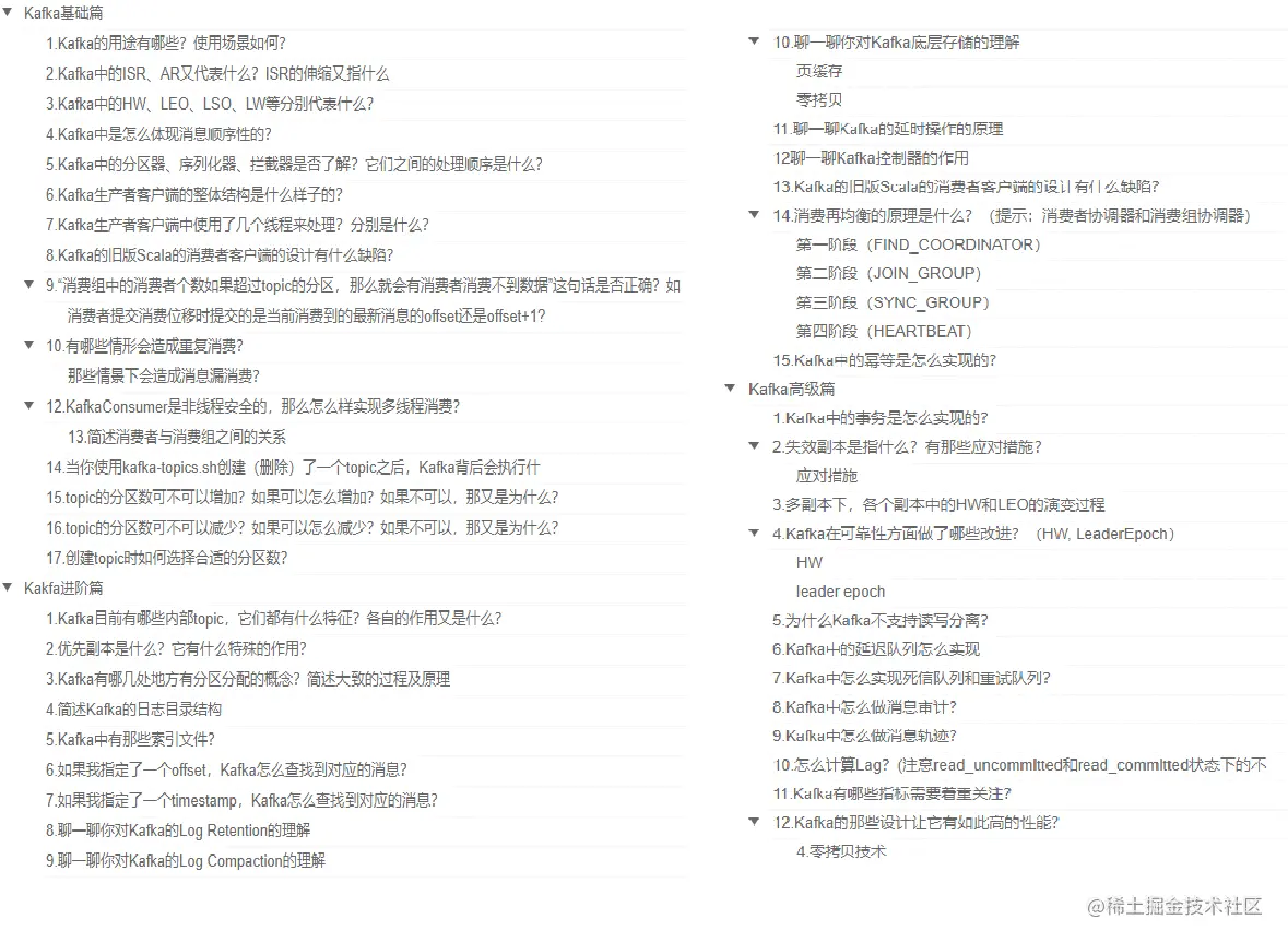互联网行业中,Kafka 承担的职责变得越来越越重要。Kafka 不仅仅承担了数据流的 “发布 / 订阅”,更是在事实上成为了 “下一代” 数据架构的基础。在这里我们将详细的整理常见的kafka面试知识笔记,先来看看目录!