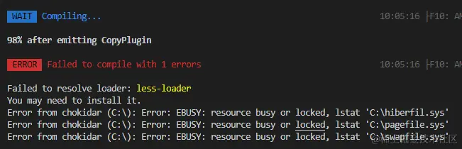 Error from chokidar (C:\): Error: EBUSY: resource busy or locked, lstat 'C:\pagefile.sys'