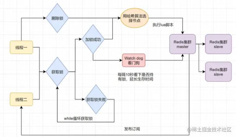 只要线程一加锁成功,就会启动一个watch dog看门狗,它是一个后台线程,会每隔10秒检查一下,如果线程1还持有锁,那么就会不断的延长锁key的生存时间。因此,Redisson就是使用Redisson解决了锁过期释放,业务没执行完问题。