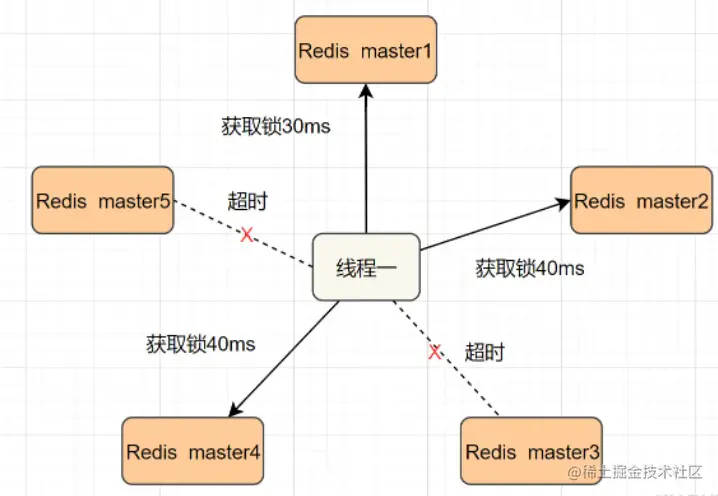 - 2.按顺序向5个master节点请求加锁。客户端设置网络连接和响应超时时间,并且超时时间要小于锁的失效时间。(假设锁自动失效时间为10秒,则超时时间一般在5-50毫秒之间,我们就假设超时时间是50ms吧)。如果超时,跳过该master节点,尽快去尝试下一个master节点。