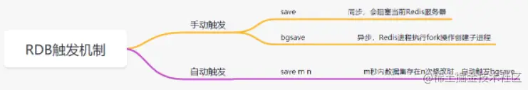 RDB持久化,是指在指定的时间间隔内,执行指定次数的写操作,将内存中的数据集快照写入磁盘中,它是Redis默认的持久化方式。执行完操作后,在指定目录下会生成一个dump.rdb文件,Redis 重启的时候,通过加载dump.rdb文件来恢复数据。RDB触发机制主要有以下几种: