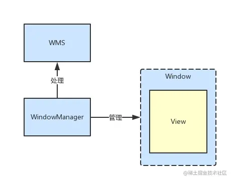Window包含了View并对View进行管理,Window用虚线来表示是因为Window是一个抽象概念,并不是真实存在,Window的实体其实也是View。WindowManager用来管理Window,而WindowManager所提供的功能最终会由WMS来进行处理。
