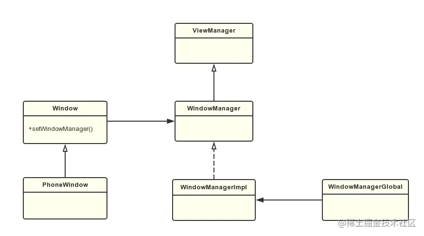PhoneWindow继承自Window,Window通过setWindowManager方法与WindowManager发生关联。WindowManager继承自接口ViewManager,WindowManagerImpl是WindowManager接口的实现类,但是具体的功能都会委托给WindowManagerGlobal来实现。