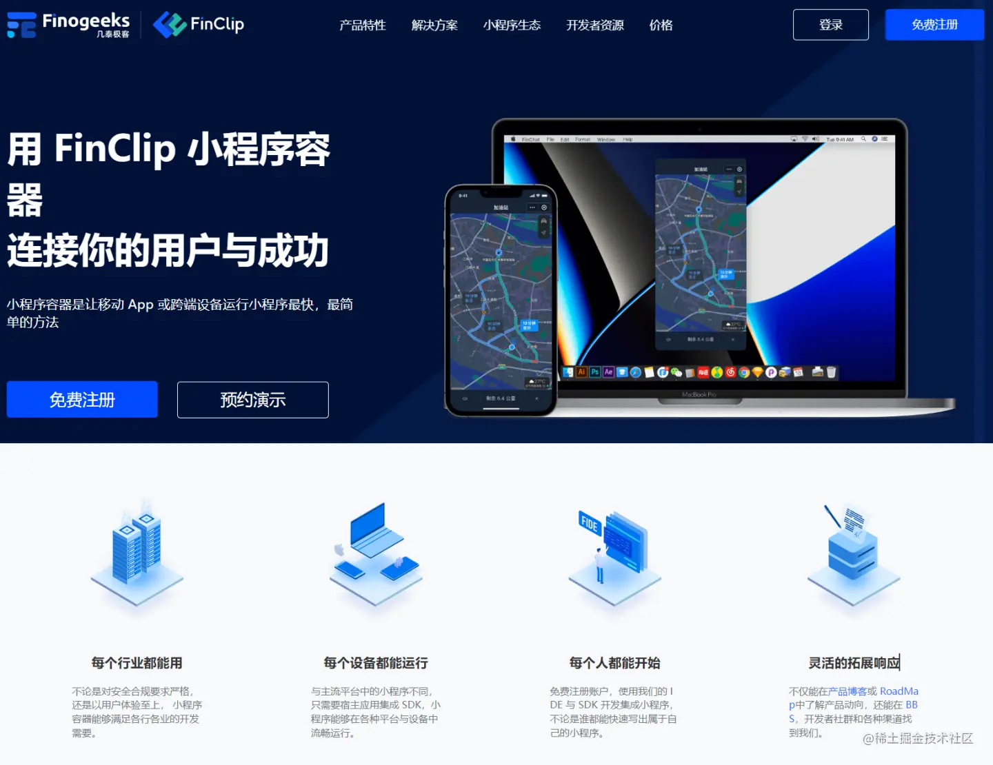 Finclip小程序开放平台,为企业提供“小程序运行能力”,它作为小程序运行的环境,为小程序提供安全沙箱、代码解析和渲染等服务。 为了让更多 APP 轻松拥有“小程序运行能力”。凡泰极客将“小程序运行时”实现成一个可私有化部署的 iOS 和 Android 版本的 SDK,可以被第三方集成。也就是说,任何 APP 通过嵌入FinClip小程序SDK即可瞬间获得运行小程序的能力。 仅需 5 行代码,即可让你的 APP 快速启动和运行小程序,而且小程序运行时 SDK,Android 端 1.3 兆,iOS端 1.8 兆,轻量无感,同时SDK采用多线程运行方式,极端情况下也不影响宿主 APP 的安全稳定运行。