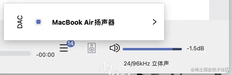 显示14的是播放列表,音箱造型的是你的声音输出源,声音那边是调节音量的。在此要注意,你的设备音量高低决定了你输出音量的高低。如果你设备音量很低,即使你这边如我所示选择了24/96khz立体声,声音依旧很低。