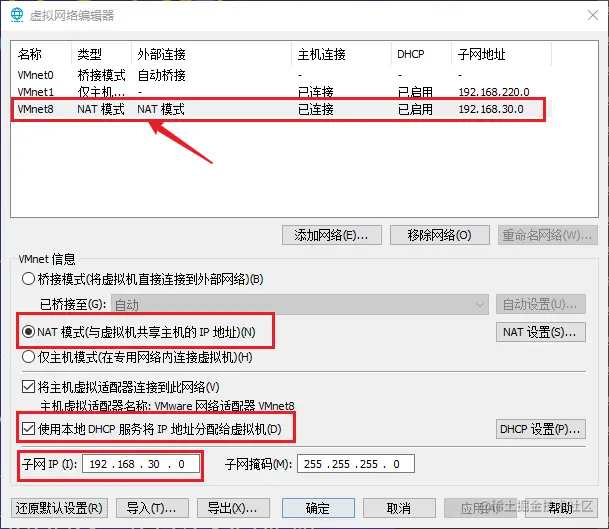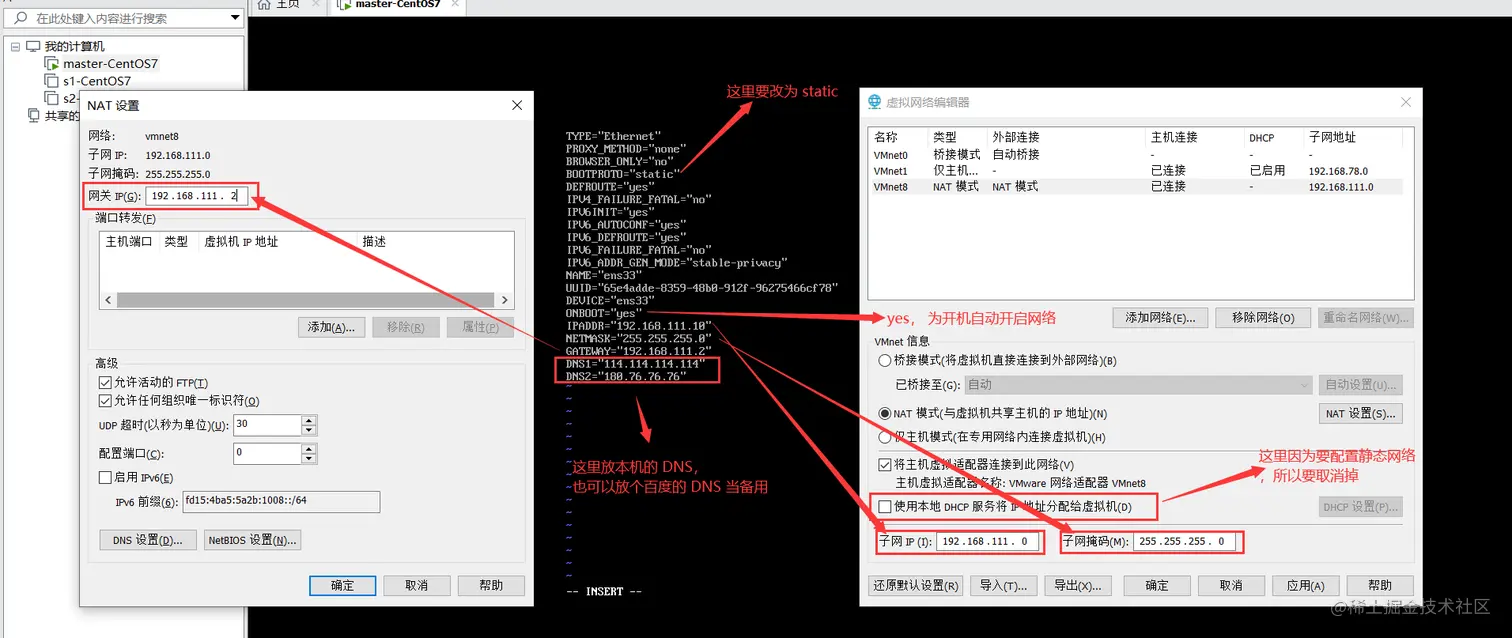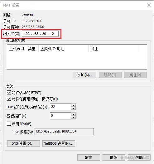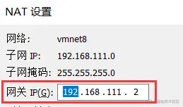 注意:IPADDR不能和子网IP冲突(最后一位只要在0~255范围内随便取一个数字,这里选择100),GATEWAY即”NAT设置“里面的网关IP。