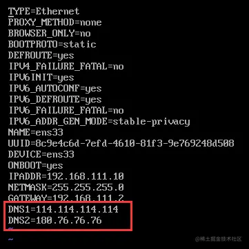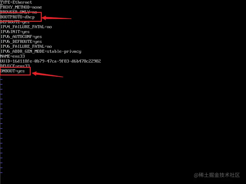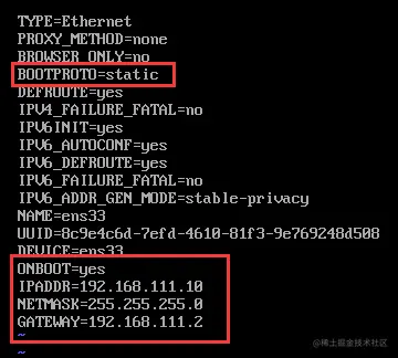 ifcfg-ens33 文件修改和添加内容后如下图:
