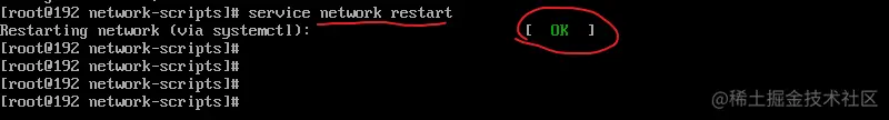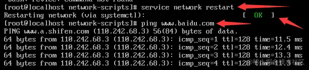 6、配置完成之后输入:service network restart,重启网卡让网卡设置生效,之后就可以上网了。