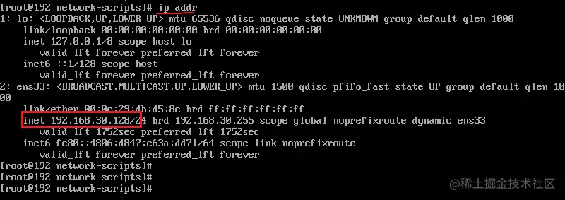 7、输入ip addr检查一下动态分配的IP,可以发现分配的动态IP为192.168.30.128。