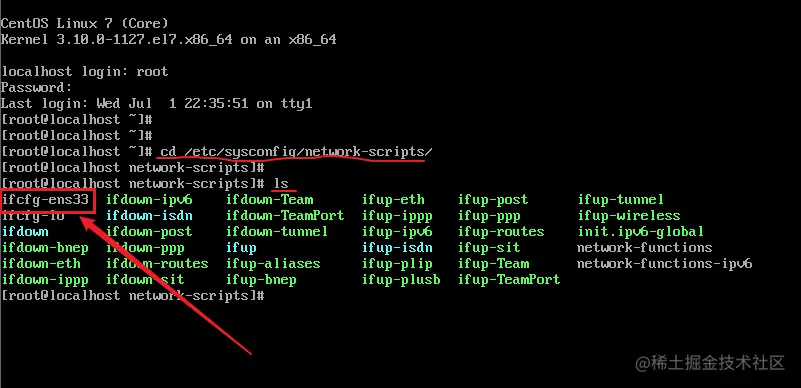 4、然后启动虚拟机,进入网络配置文件目录:cd /etc/sysconfig/network-scripts/,并且用 ls 命令查看是否有ifcfg-xxx名称的配置文件(ifcfg-lo除外),如果没有则说明网卡没有被识别,这种只能重装或者换个CentOS的版本。