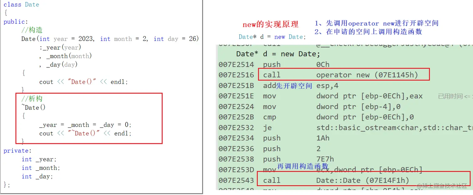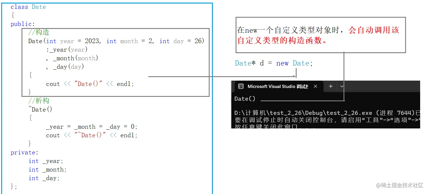 我们发现,new的使用极其简单,没有类型强转,也没有空指针的检查,并且new还有一个与C语言malloc最大的区别,就是new一个自定义类型对象时,会自动调用该自定义类型的构造函数。