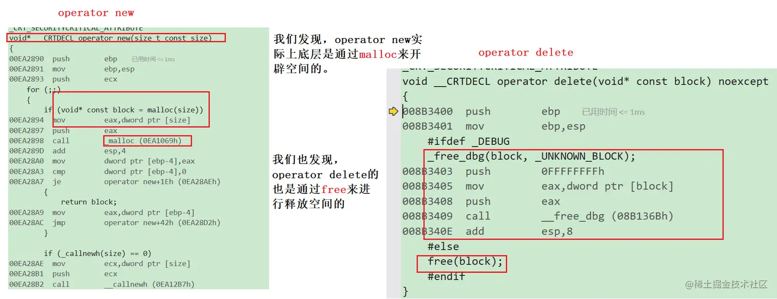我们看到operator,可能第一反应就是运算符重载,实际上这两个是个例外。operator new 和****operator delete是系统提供的全局函数。我们可以观察它们的反汇编,来查看它们的底层实现。