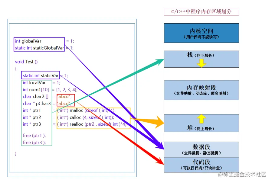我们的计算机,为了更好的对内存空间进行管理,将内存空间划分为以下几个区域:栈区、内存映射段、堆区、数据段、代码段,以及内核空间。C与C++在内存空间的分布是一致的。