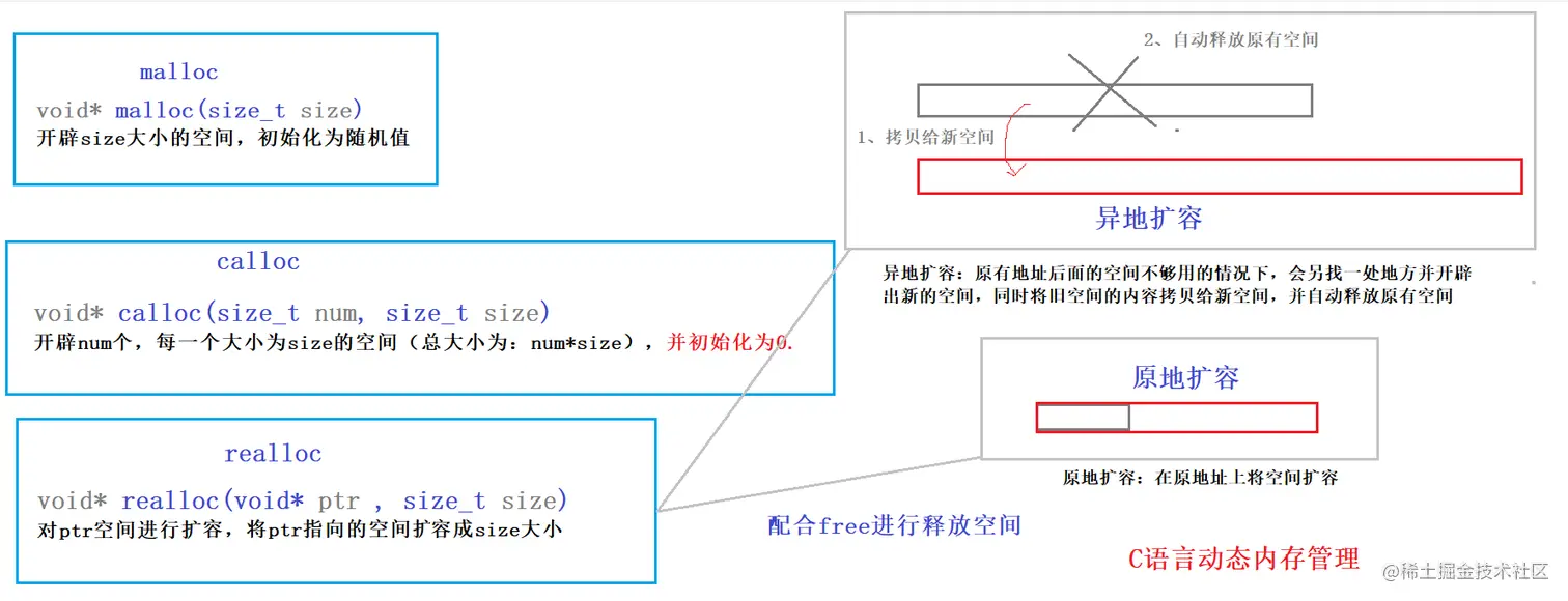 在C语言阶段,我们是使用malloc/calloc/realloc用来进行动态内存管理的,搭配free进行释放,关于这三者之间的使用方法以及注意事项,在之前的一篇文章中,有更加详细的介绍,这里就简单提一嘴。更为详细的介绍还请参考之前的文章,点击跳转。
