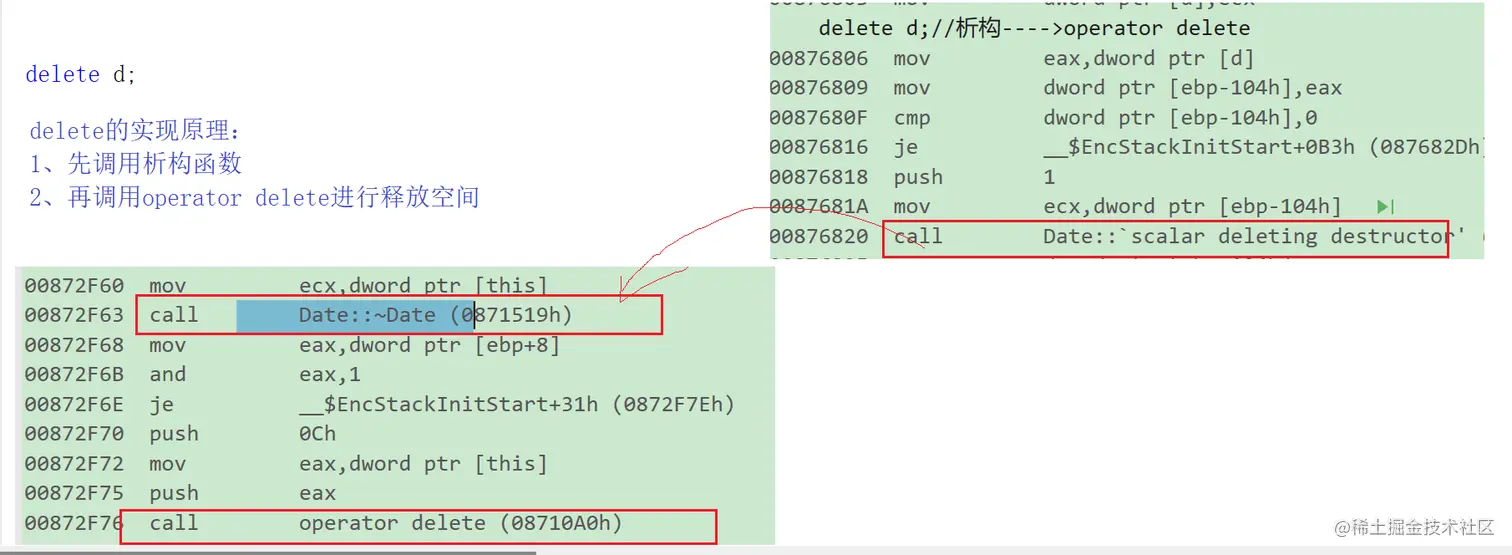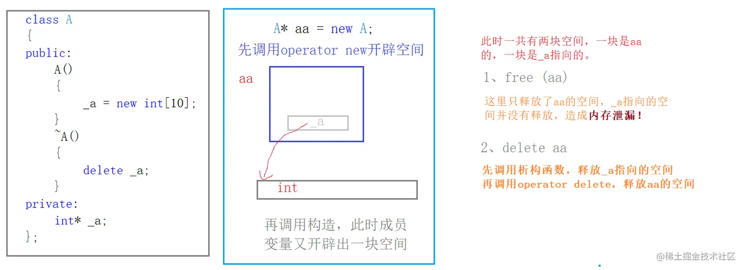 当然,与free的最大不同之处就在于delete一个自定义类型时,会先调用该自定义类型的析构函数。