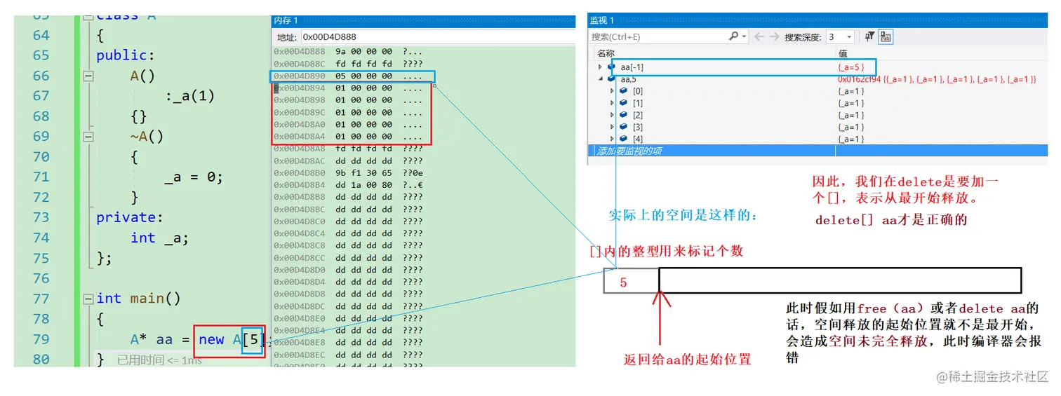 我们在给自定义类型开辟一个数组空间时,new与delete都用到了[],这里谈一谈[]的作用,实际上,在使用new开辟空间的时候,会在最前端先开辟一个整型空间,用来标记[]内的数字。但是返回给我们的是[]后面的空间的起始位置。如下:
