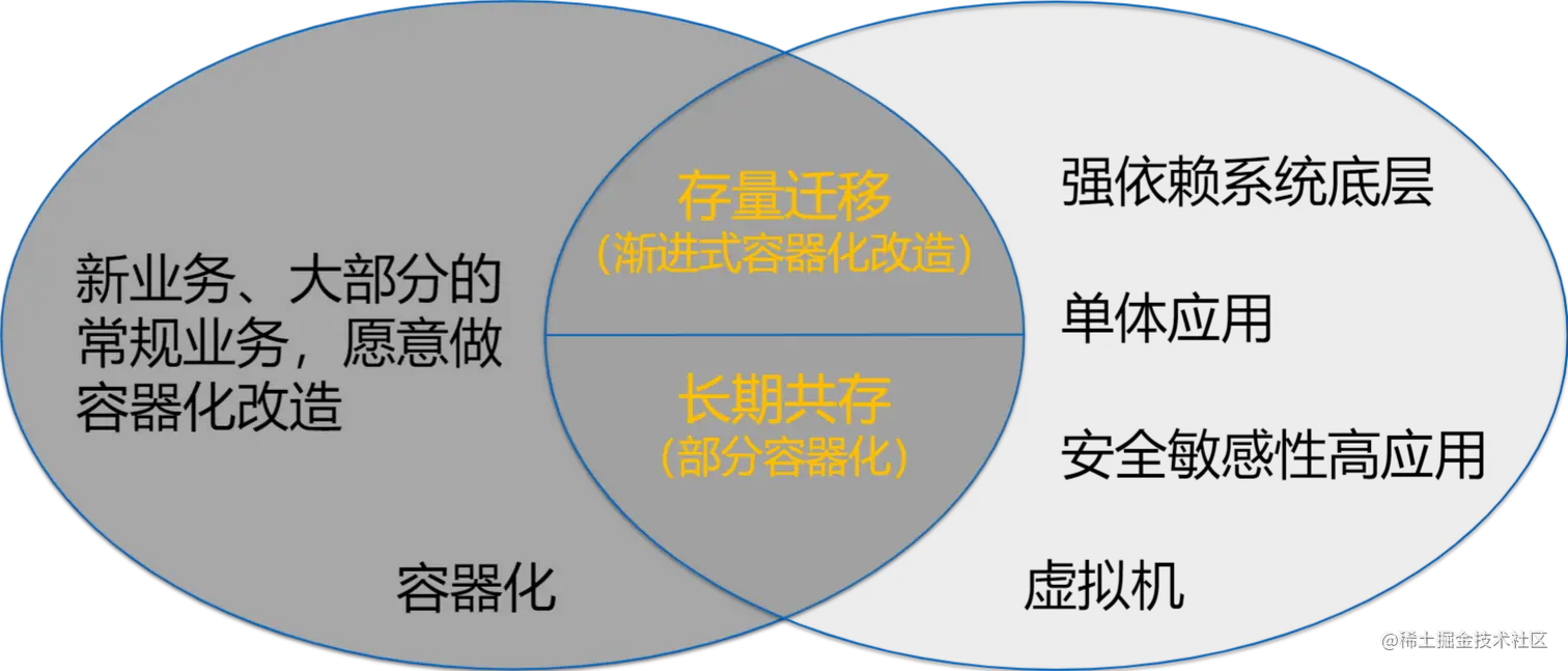 首先看基础设施,先忽略 Serverless 的场景,对新业务以及愿意做容器化改造的业务,优选的是容器,因为容器可以获得更好的资源利用率和部署效率。而对于一些强依赖系统底层的业务,比如音视频的业务,或者是简单的单体应用,往往不需要去做容器化,纯虚拟机部署就解决。而对于中间这部分容器化的过度阶段或者只能部分容器化的业务,则会出现异构基础设施容器化和虚拟机共存。