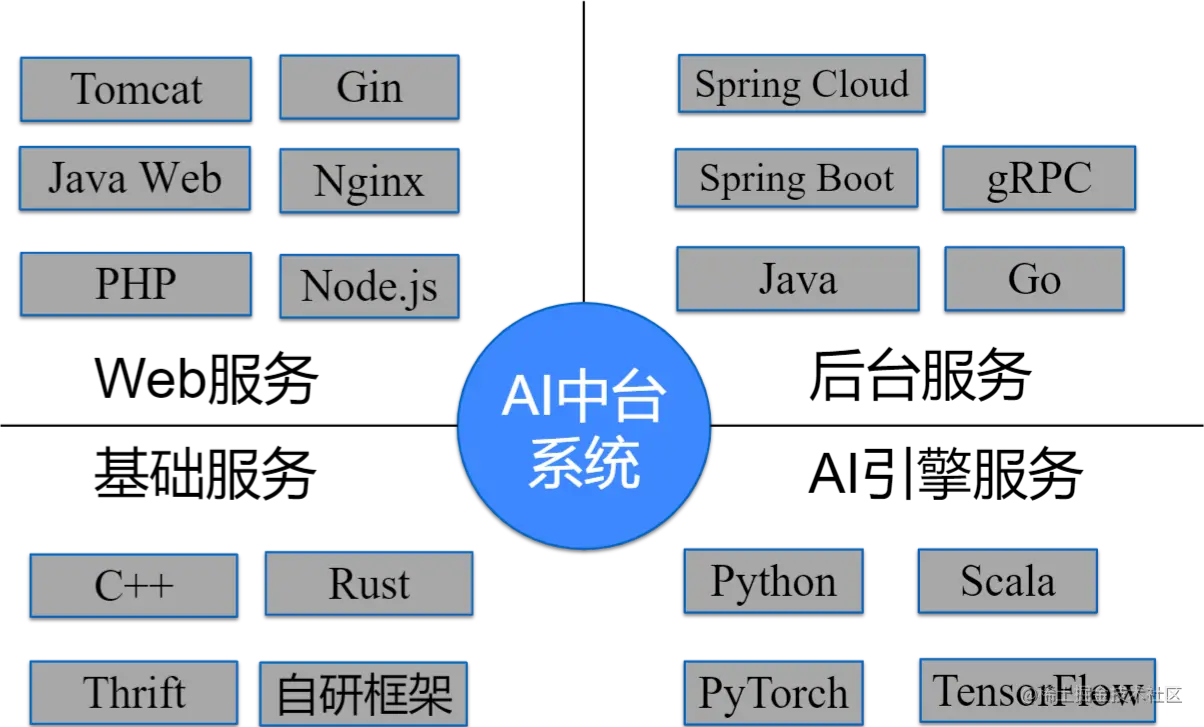 技术栈主要涉及的是开发业务所需的语言和框架,从业务的模块架构来看,最简单的业务系统,都包含2个模块,Web 前端以及后端。而对于复杂点的业务,比如像 AI 中台,包含 Web 服务、后台业务(比如用户认证、数据增删查改)、基础服务(比如存储、缓存、日志等系统),还有AI相关的服务,比如用户分析,智能推送等。每部分模块都会有最适合的语言和框架,这时候,多技术栈就是解决复杂系统开发效率最好的手段,而且也是企业架构的常态,会长期存在。