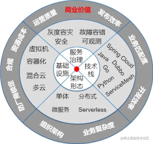 业务实现后,需要解决部署的问题。部署的基础设施一般有容器化和虚拟机,决定这方面的影响因素往往是成本,包括资源成本和运维成本。另外上云的话,基于合规以及和云厂商 argu 的考虑,企业往往也会采用混合云(比如金融类业务需要部署在金融区),或者多云方案。