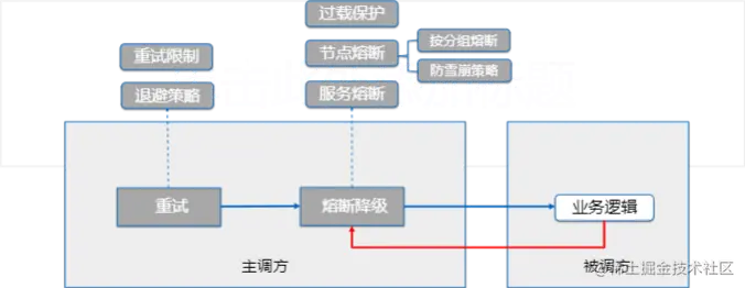 故障后除了重试,我们也需要熔断,熔断也会有2种场景,一种是针对硬件出现故障或者新上线的应用部分接口出现BUG的情况,这种场景需要主调方对所调用的资源的流量全熔断一段时间再尝试恢复。第二种情况并不是出现故障,而是出现过载了,这样的话,最合理的熔断方式是部分熔断,维持在刚好不过载的水位,对额外的低优先级请求进行丢弃。