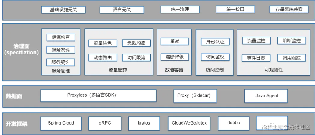 第三层是服务框架,是直接面向应用的组件,框架可以通过集成数据面组件的方式来快速接入服务治理,也自己按照标准化的定义来进行功能的实现。