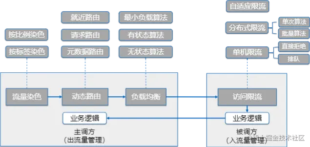 流量管理包含了主调方的出流量管理,以及被调方的入流量管理。比如对于灰度的场景,10%流量发送到灰度分组,那么首先 SDK 会按百分比的方式对流量进行染色,加上请求标签,接下来,会通过请求路由根据请求标签,匹配出灰度分组的实例列表。最后再通过负载均衡算法,筛选出目标实例。而在被调方,则会根据自己的系统容量,对请求进行限流判断,对于超过 QPS 配额的流量, 可以进行拒绝或者排队。