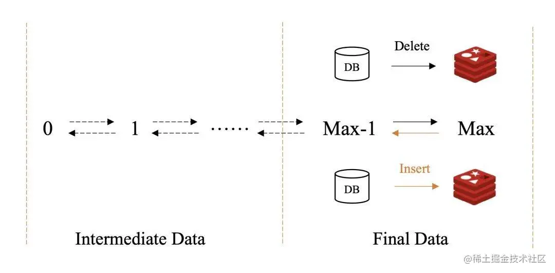 需要指出,中间态数和终态数据不是绝对的,是依据对应所处的系统环节判定,在特定范围内生效。如在隐私号选择环节,需要从Redis数据库中检索到可用的号码。每次绑定、解绑都会导致隐私号的绑定数数量的变化,绑定数会在0到最大复用次数Max间来回变化。当隐私号的绑定数没到达最大复用次数Max的临界值时,一个隐私号已绑定了1次,和已绑定了10次,对于选号系统来说,性质是一样,都表示该号码仍可以继续绑定。此处[0,Max-1)范围内的绑定数变化不会对系统决策产生影响,可视为中间态数据。当绑定数从Max-1增加到Max时,则需要从可选号码集合中清除该号码。当绑定数从Max减少到Max-1时,则应该将该号码重新添加到可选号码集合中,因此[Max-1,Max]是检索可用号码过程的终态数据。