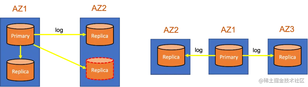 - 一种是两AZ有三副本,其中AZ1有两副本,AZ2有一个副本;若是四个副本,那么AZ2会再多一个副本,以此保证AZ1挂了之后AZ2还能有足够多的副本。