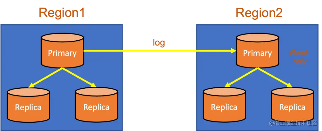 跨Region一般是以灾备实例的形态存在。备Region的Primary节点一般会设置为只读。在Region1出现异常的情况下,为了保证数据的一致性,需要人工决策是否切换,所以一般也不会自动切,而是选择手动切换。