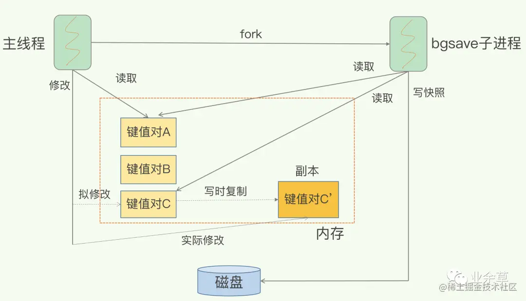 在执行快照的同时,Redis就会借助操作系统提供的写时复制技术(Copy-On-Write, COW),正常处理写操作。bgsave子进程是由主线程fork生成的,可以共享主线程的所有内存数据。bgsave子进程运行后,开始读取主线程的内存数据,并把它们写入RDB文件。
