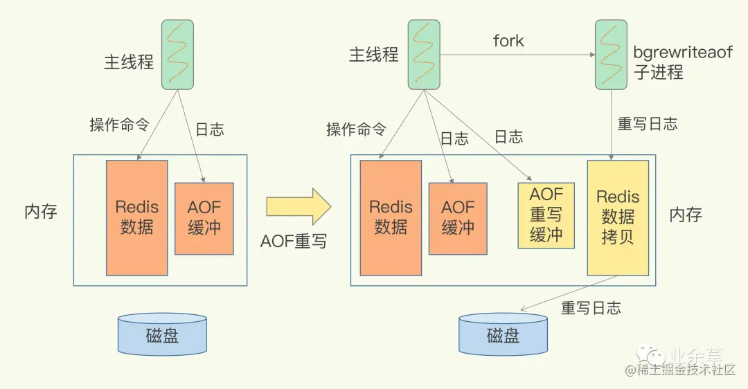 一个拷贝就是指,每次执行重写时,主线程fork出后台的bgrewriteaof子进程。此时,fork会把主线程的内存拷贝一份给bgrewriteaof子进程,这里面就包含了数据库的最新数据。然后,bgrewriteaof子进程就可以在不影响主线程的情况下,逐一把拷贝的数据写成操作,记入重写日志。