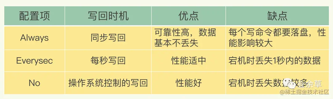 Always同步写回:每个写命令执行完,立马同步地将日志写回磁盘。Everysec每秒写回:每个写命令执行完,只是先把日志写到AOF文件的内存缓冲区,每隔一秒把缓冲区中的内容写入磁盘。No操作系统控制的写回:每个写命令执行完,只是先把日志写到AOF文件的内存缓冲区,由操作系统决定何时将缓冲区内容写回磁盘。