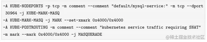 既然利用iptables做了一次DNAT,为了保证回程报文能够顺利返回,需要做一次SNAT。Kube-proxy创建的对应iptables规则形如: