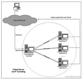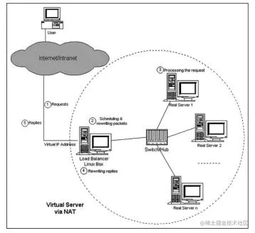IPVS支持TCP、UDP、SCTP、IPv4、IPv6等协议,也支持多种负载均衡策略,例如rr、wrr、lc、wlc、sh、dh、lblc等。IPVS通过persistent connection调度算法原生支持会话保持功能。LVS的工作原理如图4-6所示。