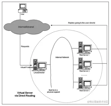 IPVS的DR模式如图4-7所示。DR模式是应用最广泛的IPVS模式,它工作在L2,即通过MAC地址做LB,而非IP地址。在DR模式下,要求IPVS的Director和客户端在同一个局域网内。另外,DR不支持端口映射,无法支撑Kubernetes Service的所有场景。