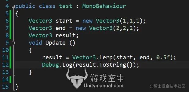 插值是数学上的一个概念,在这里用公式表示就是:from + (to - from) * t;这也就是Lerp的返回值(用这个公式分别算出x,y,z)。