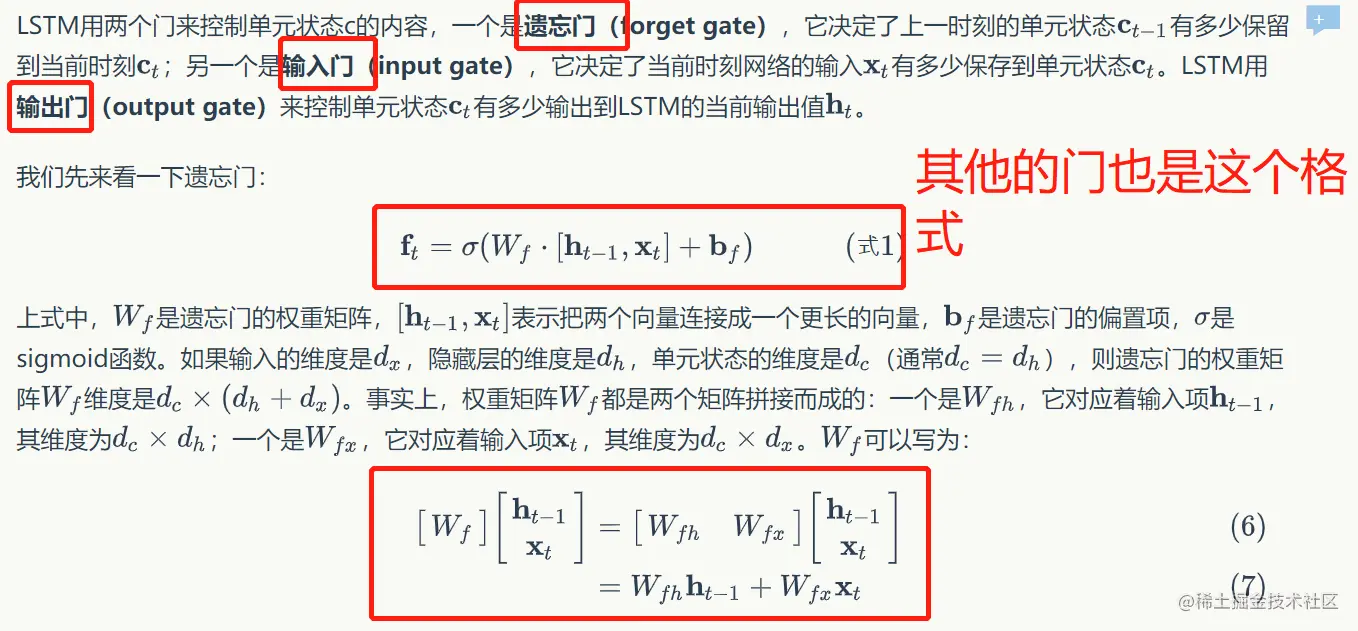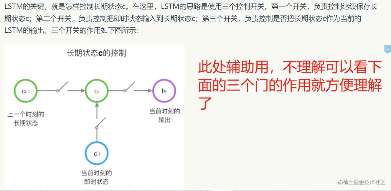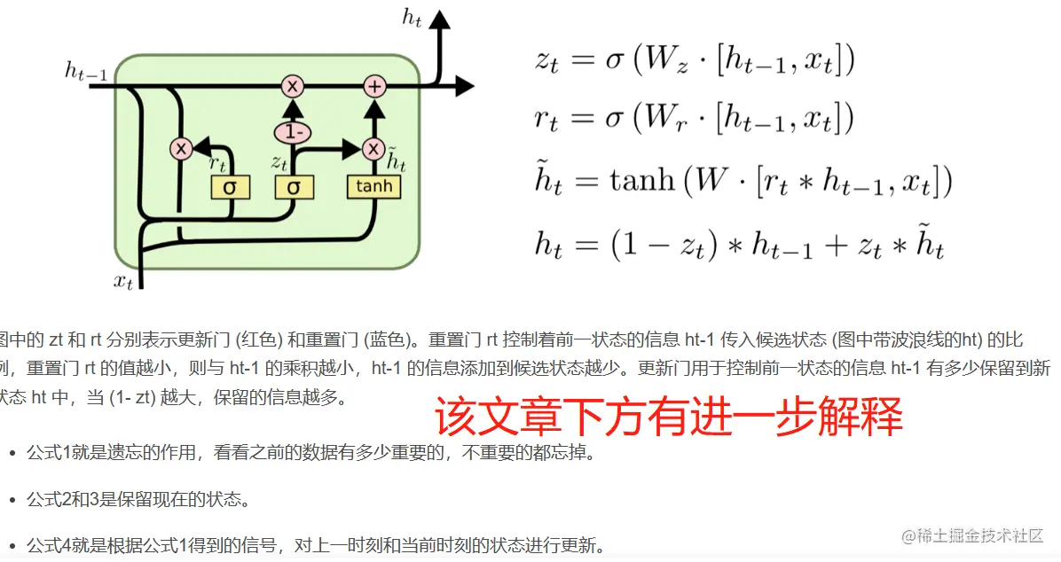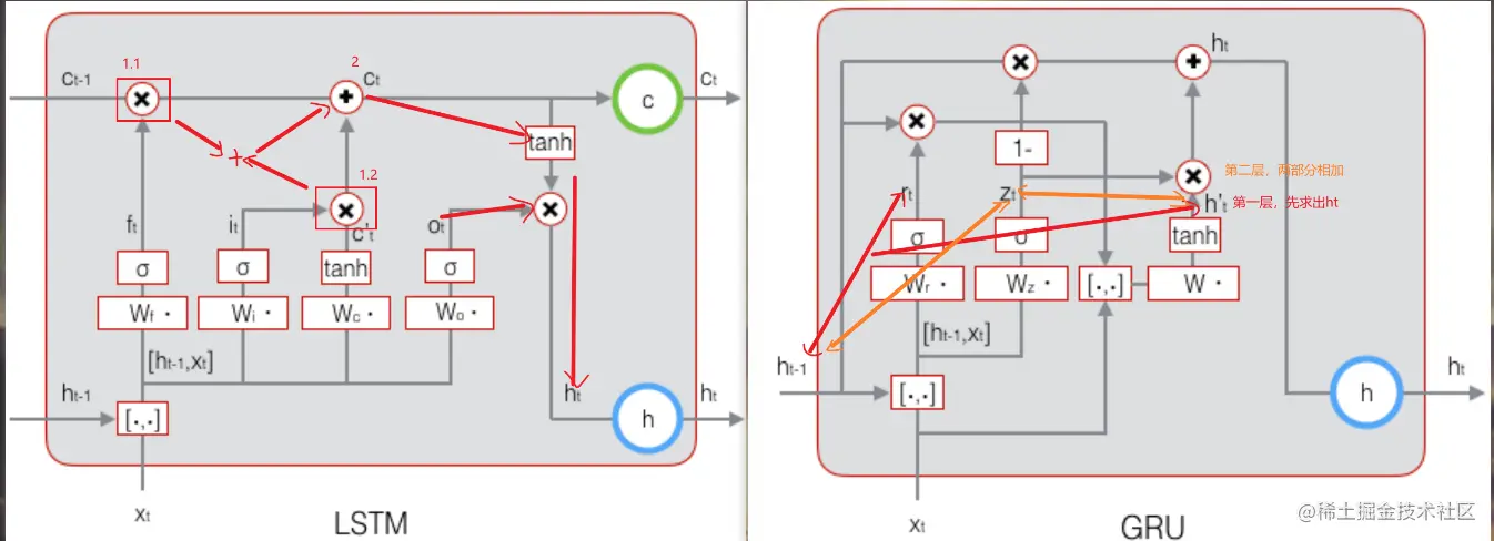 - 关于GRU为啥结构简单了却能实现和LSTM不相上下的效果,可以看参考资料,个人觉得对于保存过去信息这一概念在数学公式上的表达,简答理解能相通即可,太复杂的去想反而容易无解,LSTM保留信息部分还有GRU保留信息部分可以参考下图。
