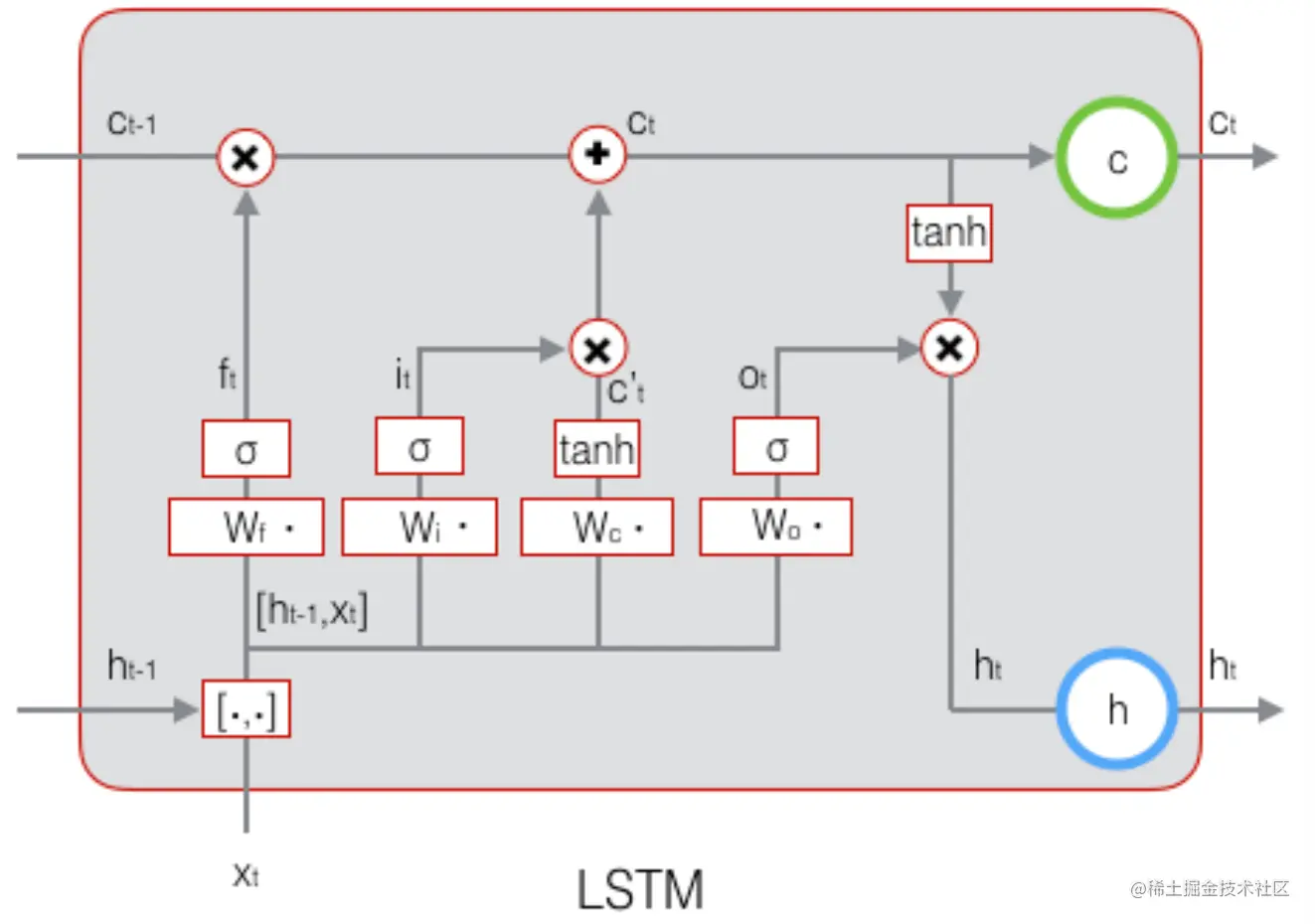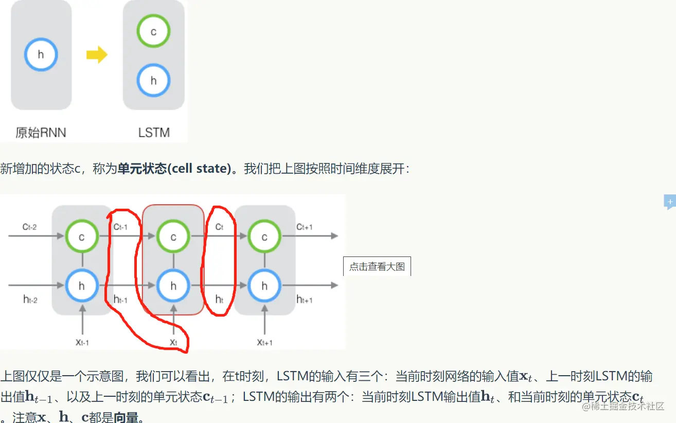 - 简单来说LSTM就是在隐藏层只有h状态的基础上,又加入了一个c,用来保存长期状态