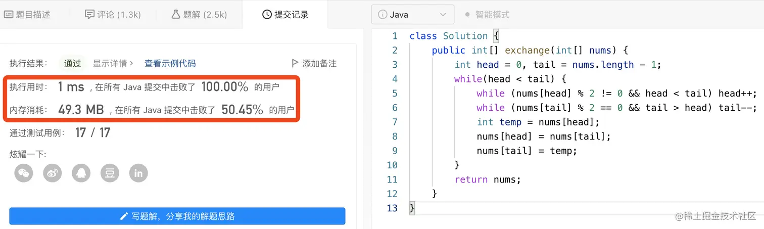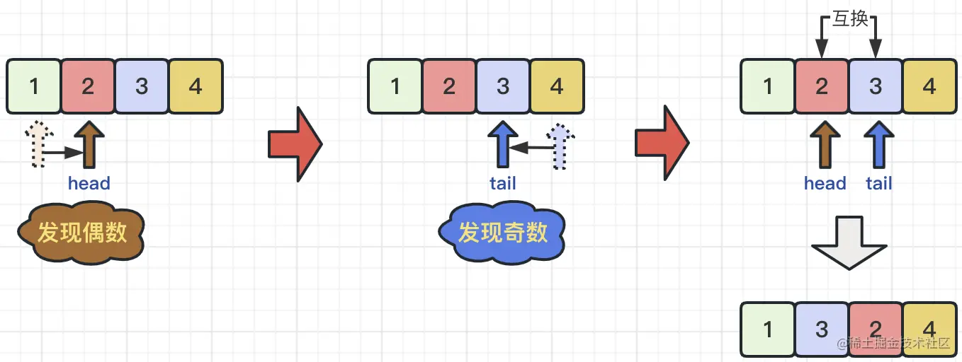 那么,由于head指针与tail指针是以相对方向移动的,那么肯定会有“碰头”的那一刻,那么当碰头了之后,就说明整个数组nums已经完全遍历完毕,也就是说,所有的奇数和偶数都已经完成了互换的操作。