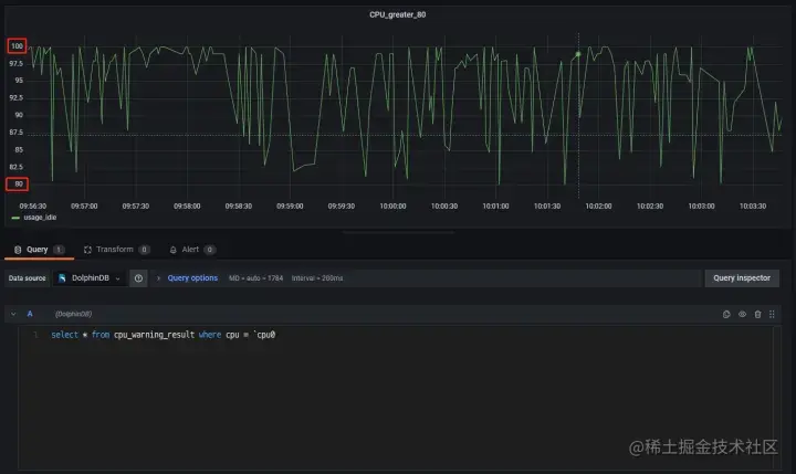 8. 登录 Grafana 监控 CPU 利用率大于80%的预警数据。连接上 DolphinDB 数据源并创建面板 Panel 后,直接可视化 cpu_warning_result 中的数据即可(这里只监控了单核 cpu0 的预警数据)。