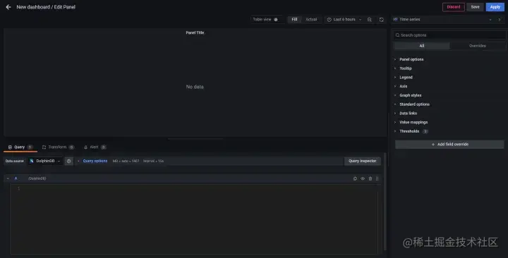 4. 依次点击“Dashboards” >> “Browse“>>”New”>>”New Dashboard”>>”Add a new panel”,新建一个数据面板。